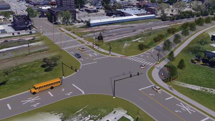 HEI, was selected on a team with CMT to provide Phase I and II engineering services for $30M of improvements in downtown East Moline funded by a combination of $23.7M in Federal RAISE funds and the remainder with local agency funds. The project consists of four sections of improvement to the Bend and Rust Belt Districts as well as 15th Avenue through the downtown business district. HEI is specifically responsible for Phase I and II engineering for improvements to 12th Avenue from 1st Street to 7th Street through the Rust Belt District and Phase II engineering services for streetscape improvements to Bend Boulevard and Mississippi Parkway. Improvements to 12th Avenue consist of reconstructed PCC pavements with integral curbs, addition of a 10’ multi-use path, storm sewer improvements, new traffic signals with railroad preemption at 3rd Street and 7th Street, streetscaping, and associated work. HEI services include alignment studies, intersection design studies, traffic signal design, railroad coordination, crash analysis, drainage studies, utility coordination, public involvement, construction staging, project development report, plans, specifications and estimates for state lettings. The improved 12th Avenue will provide pedestrian friendly access and additional roadway capacity for the ongoing development in the Bend and Rust Belt Districts. Improvements to Bend Boulevard and Mississippi Parkway include installation of new ADA compliant PCC multi-use paths and sidewalks, raised crosswalks, landscaping, and streetscape amenities. HEI services included utility coordination, IDOT coordination, and preparation of plans, specifications, and estimates for a January 2026 IDOT letting. This project has already proven to showcase the effectiveness of a well-connected and compatible owner/design team. All four sub-project areas continue to be on schedule, which exemplifies the success of a partnered approach to improving the quality of community spaces by re-imagining transportation challenges. The project will enhance connectivity between East Moline residents and their former industrial riverfront, creating safe bike and pedestrian connections between neighborhoods and the river. It will also facilitate economic development by enabling further redevelopment of an abandoned factory site and allowing the city’s business district to benefit from this growth and redevelopment. One of the project’s main challenges is the strict deadline imposed by the terms of the RAISE grant, which requires effective coordination with the Owner, engineering partners, contractors, federal and state agencies, railroads, business owners, and the public.